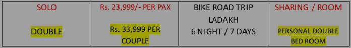 β’ Any bonfire expenses Room Service/Restaurant Expenses Security Deposit for Bike - INR 8000/bike (refundable)