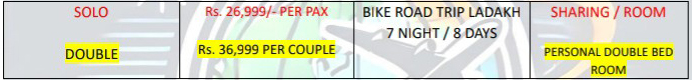 ➒ Any bonfire expenses Room Service/Restaurant Expenses Security Deposit for Bike - INR 8000/bike (refundable)